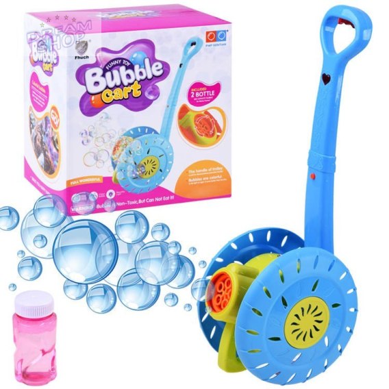 Bańki mydlane to ulubiona zabawa małych i dużych dzieci. Rewelacyjna maszynka do robienia baniek mydlanych w kształcie pchaczyka, kołowrotka na pewno zapewni mnóstwo radości każdemu dziecku. Zabawka pozwala na puszczanie kolorowych baniek z automatu. Wystarczy tylko do dolnej części kołowrotka przykręcić buteleczkę z płynem, włączyć przycisk znajdujący się na rączce pchaczyka uruchamiając wiatraczek i obrót tarczy, który podczas kręcenia wypuszcza magiczne, tęczowe bańki. Ale to nie wszystko podczas zabawy słychać wesołą melodię oraz migają kolorowe światełka.