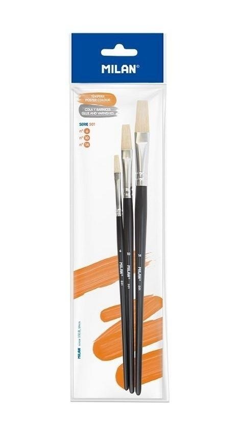 Zestaw 3 szt. pędzli serii 501 nr 6, 10, 14. Pędzle płaskie ze szczeciny z krótkim czarnym drewnianym lakierowanym trzonkiem. Aluminiowa skuwka bez spawania, odporna na rdzewienie. Naturalne włosie ze szczeciny Chungking jest trwałe i gęste przez co pędzel jest niezwykle uniwersalny, dla różnych technik i powierzchni. Nadaje się do rękodzieła i dekoracji oraz malarstwa olejnego i akrylowego.