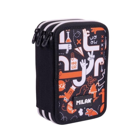 Piórnik 3-poziomowy z wyposażeniem, który pozwala zachować porządek i łatwy dostęp do przyborów szkolnych. Kolekcja Fingers inspirowana jest wyrazistymi gestami uniwersalnej komunikacji i sztuczkami rąk, łącząc kolory czarny, pomarańczowy i biały w zabawny nadruk. Zawartość zestawu: 1 gumka 4024, 1 temperówka AFILA, 1 ołówek grafitowy HB, 3 długopisy P1 (niebieski, czarny i czerwony), 1 trójkątna linijka 15 cm, 12 trójkątnych kolorowych kredek, 6 metalicznych kredek, 5 zakreślaczy, 1 nożyczki Basic i 18 flamastrów. Materiał zewnętrzny i wewnętrzny 100% poliester. Rozmiar piórnika: 19,5 x 13 x 7,5 cm. W piórnikach znajdziesz kredki MILAN przy produkcji których użyto drewna pochodzącego wyłącznie z plantacji, gwarantujących nieużywanie drewna z lasów deszczowych. Rysik kredki na całej długości jest przyklejony do drewna co zapobiega jego łamaniu. Dzięki trójkątnej budowie kredka jest ergonomiczna i wygodnie trzyma się dziecku. Flamastry MILAN posiadają wytrzymałą i elastyczną stożkową końcówką, która nie wpada do środka nawet przy silnym nacisku. Po chwilowym odkształceniu końcówka zawsze wraca do pierwotnego kształtu. Tusz na bazie wody. Flamastry nie zawierają ftalanów, metali ciężkich i innych. Temperówkę z bezpiecznym przykręconym ostrzem dzięki czemu ostrze nie oddzieli się od obudowy temperówki. Gumkę z naturalnym kauczukiem.