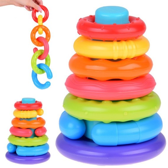 Wysokość piramidki po złożeniu: ok 18 cm Średnica krążków: od 7,5 cm do 12 cm