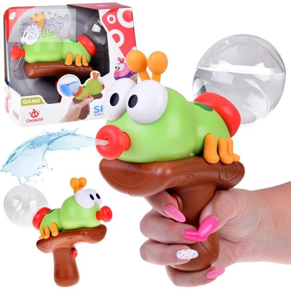 Pistolet na wodę przyciąga uwagę dzięki bajkowemu wyglądowi - zabawny robaczek ma duże oczy, urocze czułki i otwarte usta, z których po naciśnięciu przycisku tryska woda. Całość została osadzona na wygodnej, kolorowej rękojeści, która pełni funkcję uchwytu oraz spustu do strzelania wodą.