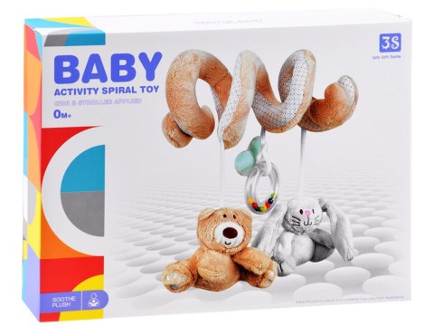 Pluszowa spirala została wyposażona w zabawki: - miś - kółko - grzechotkę z kolorowymi kuleczkami - króliczek z długimi uszami