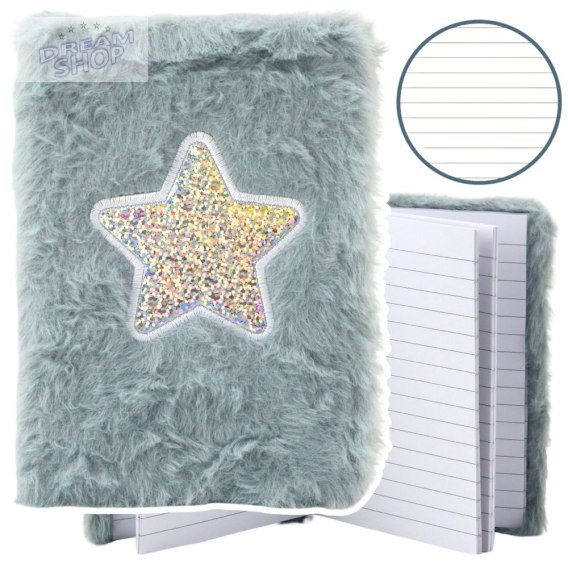 Pluszowy notatnik z błyszczącą aplikacją w kształcie gwiazdy to idealne połączenie funkcjonalności i stylowego wyglądu. Miękka okładka pokryta przyjemnym w dotyku futerkiem w szarym odcieniu przyciąga wzrok i nadaje całości wyjątkowego charakteru.