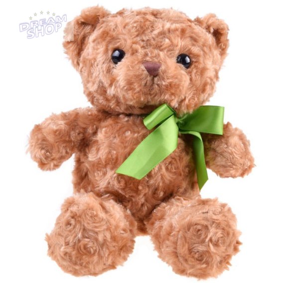 Pluszowy brązowy miś to maskotka dla każdego. Uroczy, brązowy niedźwiadek ma ok. 30 cm wzrostu, brązowe plastikowe oczka, wyszywany nocek i zieloną błyszczącą kokardę pod szyję, prawdziwy elegant. Maskotka wykonana została z przyjemnego, mięciutkiego materiału. Miś jak to przystało na misia może stać się świetnym prezentem dla każdego! Taka maskotka jest idealna do tulania, głaskania, zwierzania tajemnic, czytania, podróżowania itp.