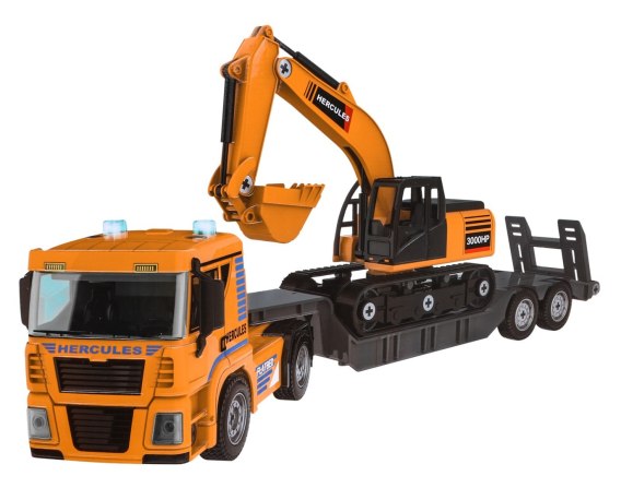 Duży, znakomicie wykonany zestaw ciężarówka z koparką do samodzielnego montażu to propozycja dla dzieci od trzeciego roku życia. Zestaw składa się z 185 elementów. Zabawka posiada efekty dźwięku i światła. Na górze ciężarówki mrugają światełka oraz słychać odgłosy zapłonu samochodu, cofania i klaksonu. Kabina ciężarówki pochyla się do przodu. Wkrętarko-wiertarka wydaje odgłosy podczas wiercenia czy wykręcania oraz świeci się niebieska dioda. Kabina koparki obraca się o 360 stopni a ramię z łyżką podnosi się w górę i w dół oraz wykonuje manewry nabierania i wysypywania. Zestaw zawiera 3 wymienne końcówki do koparki: łyżkę, wiertło oraz chwytak. Ciężarówka posiada gumowe opony, poradzi sobie z jazdą w różnym terenie. Zabawka zasilana jest bateriami typu 3 x 1.5 AG13 (w zestawie), wkrętarko-wiertarka bateriami 3 x AA 1.5V (brak w zestawie). Funkcje zabawki: - efekt światła - ciężarówka i wkrętarko-wiertarka, - efekt dźwięku - ciężarówka i wkrętarko-wiertarka, - pochylana do przodu kabina ciężarówki, - obrót kabiny koparki o 360 stopni, - ruchome ramię koparki, - wymienne końcówki do koparki, - gumowe opony, - napęd friction,