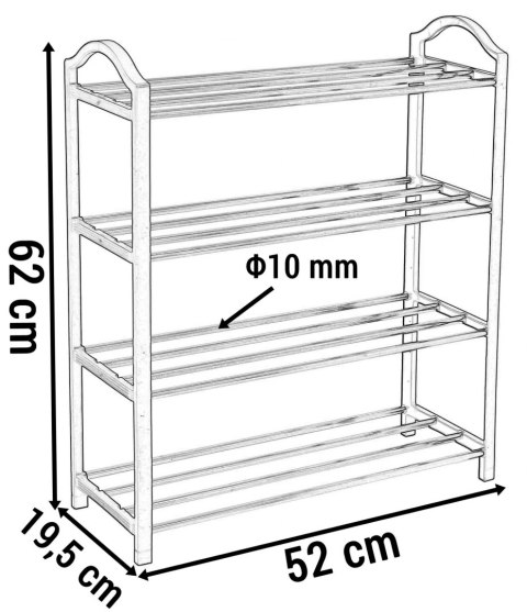 Wykonana z elastycznego tworzywa oraz metalowych rurek półka na buty. Konstrukcja regału jest lekka i wytrzymała. Uniwersalny projekt sprawia, że półka wpasuje się do każdego mieszkania. Cztery poziomy pomieszczą po dwie pary każdy.