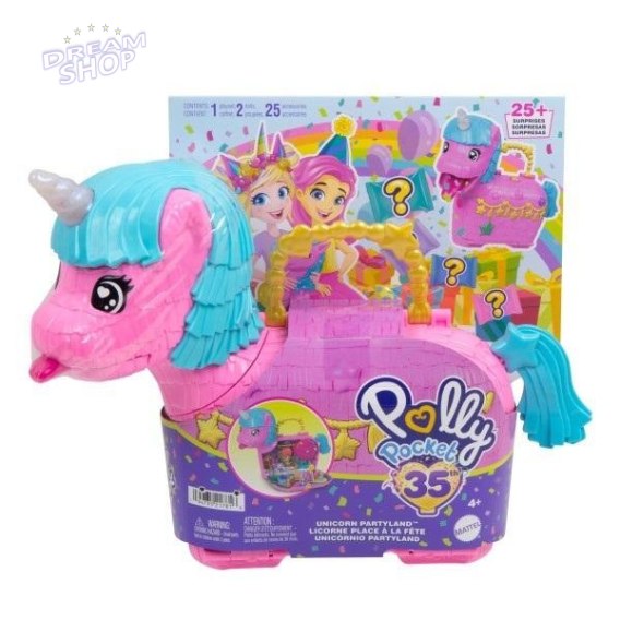 Świętuj 35 urodziny Polly Pocket z zestawem do zabawy dla dzieci Jednorożec niespodzianka! W tym zestawie dla dzieci od 4 lat są 2 mikrolalki i ponad 25 uroczych akcesoriów, w tym śliczne figurki jednorożców. Zabawa dopiero się rozkręca! Są aż dwa sposoby na odkrywanie niespodzianek: tęczowe torebki wypadają z pyszczka jednorożca, a po podniesieniu ogona wysypują się akcesoria. Niespodzianki można wkładać z powrotem, aby powtarzać zabawę wciąż od nowa. Zabawka ma kształt uroczego jednorożca-piniaty, a po otwarciu odsłania magiczne przyjęcie, podczas którego lalki mogą polatać balonem, na przemian bujać się na huśtawce, a potem rozkoszować pysznym tortem w parku. Z Polly Pocket i przyjaciółmi zabawa nigdy się nie kończy! Wspaniały prezent dla dzieci od 4 roku życia, zwłaszcza tych, które uwielbiają tęcze, jednorożce i niespodzianki. Kolory i elementy dekoracyjne mogą się różnić.