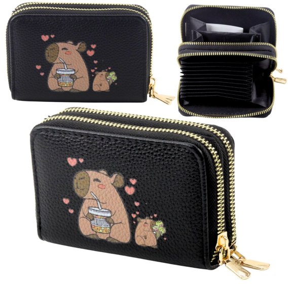 Czarny portfel z uroczym motywem kapibary to funkcjonalny i wygodny dodatek, który łączy kompaktowy rozmiar z dużą pojemnością. Wyposażony w dwie oddzielne komory zamykane na zamki błyskawiczne, zapewnia wygodne przechowywanie kart, banknotów, monet oraz innych niezbędnych drobiazgów. Dzięki harmonijkowej konstrukcji wewnętrznej portfel oferuje wiele przegródek, które ułatwiają porządkowanie zawartości.