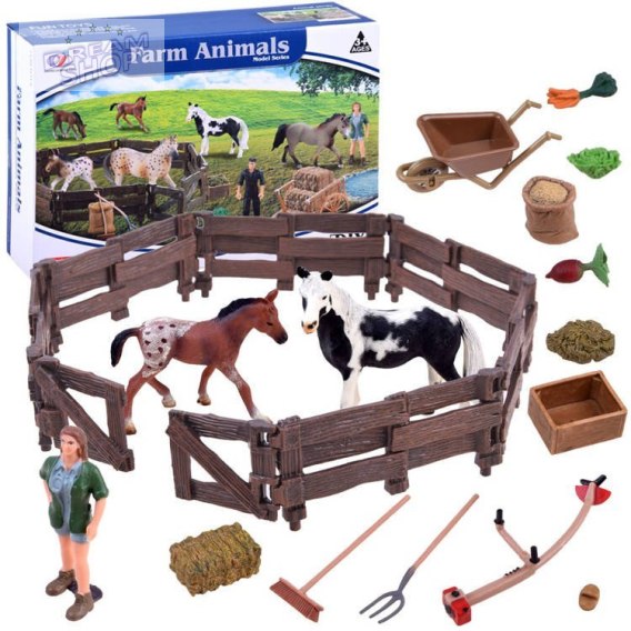 - Elementy zagrody - w zestawie znajdują się taczki, korytko, widły, miotła i kosiarka, które pozwolą dziecku na odtworzenie codziennej pracy na farmie.