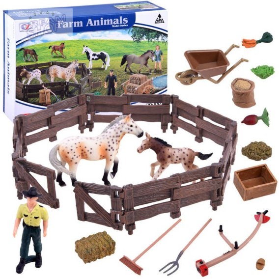 Zestaw figurek ręcznie malowanych, zagroda ze zwierzętami, koń konie źrebak farmer, gospodarstwo