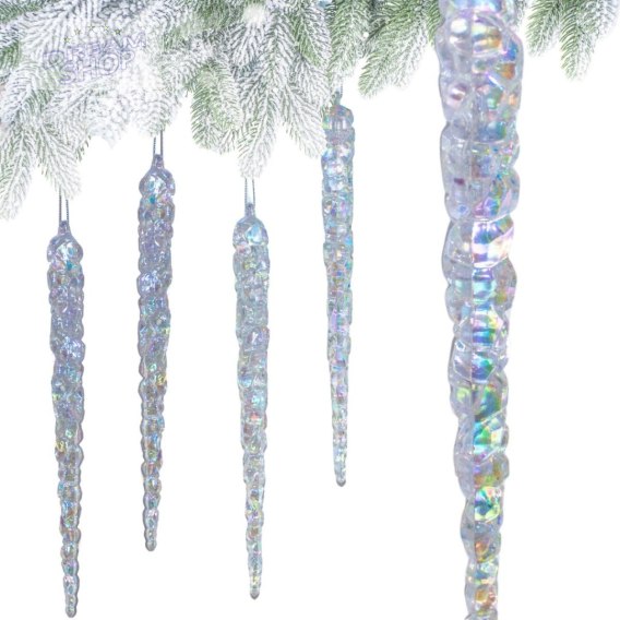 Przeźroczysty polistyren imituje naturalny kryształowy lód, dzięki czemu dekoracja wygląda świeżo i mroźnie. Pod światłem lamp choinkowych lub słońca sople delikatnie się mienią, tworząc zimową aurę.
