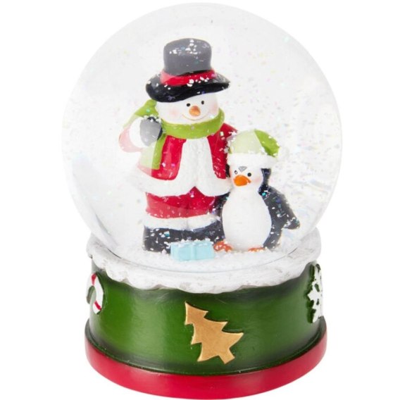 • dekoracyjna kula świąteczna z figurką bałwana i pingwinka w środku