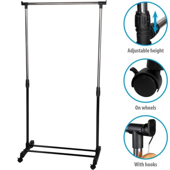 Wieszak posiada cztery obrotowe kółka, dzięki czemu łatwo go przemieścisz z miejsca na miejsce, nawet gdy jest w pełni załadowany ubraniami. To wygodne rozwiązanie, gdy chcesz szybko zmienić jego położenie, posprzątać lub przenieść garderobę do innego pomieszczenia.