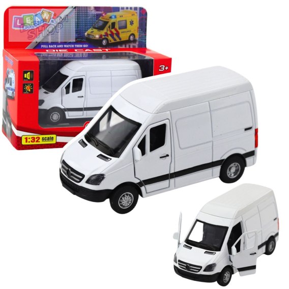 BIAŁY SAMOCHÓD DOSTAWCZY W SKALI 1:32 METALOWY Z NAPĘDEM PULL BACK ŚWIATŁO DŹWIĘK