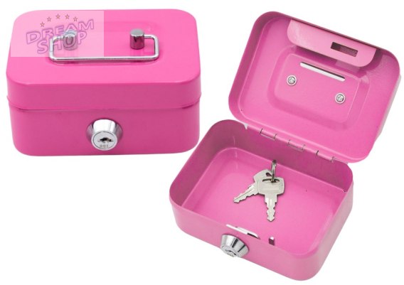 Metalowa skarbonka w różowym kolorze jest idealna dla dzieci do nauki oszczędzania i dbania o cenne przedmioty. Ma otwór na pieniądze i zamykana jest na klucz, w zestawie są dwa kluczyki. Może służyć również jako schowek na ważne rzeczy.