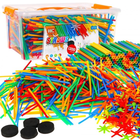 Duży zestaw klocków - słomek konstrukcyjnych to zabawka dla dzieci od 3 - go roku życia. W zestawie jest aż 1200 elementów, z których Twoja pociecha może zbudować wiele wspaniałych konstrukcji takich jak: wieże, pojazdy, mosty, budynki itp. Patyczki doskonale się ze sobą łączą za pomocą łączników. Są różnokolorowe: zielone, czerwone, niebieskie, pomarańczowe i żółte. Całość zapakowana jest w plastikową skrzyneczkę z uchwytem do przenoszenia. Zabawa słomkami rozwinie wyobraźnię u Twojej pociechy, nauczy kreatywnego i logicznego myślenia.