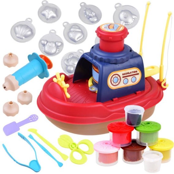 Statek rybacki z masa plastyczną do zabawy, tworzenia zwierzątek morskich takich jak rybki, żółw, kraby, krokodyl, muszelki, rozgwiazdy. Plastikowa łódka z kominem do wyciskania form, jest łatwa w obsłudze. Zestaw wyposażony w akcesoria, które ułatwią zabawę podczas tworzenia podwodnego świata. Zabawa łódką i akcesoriami jest bardzo kreatywna i ciekawa.