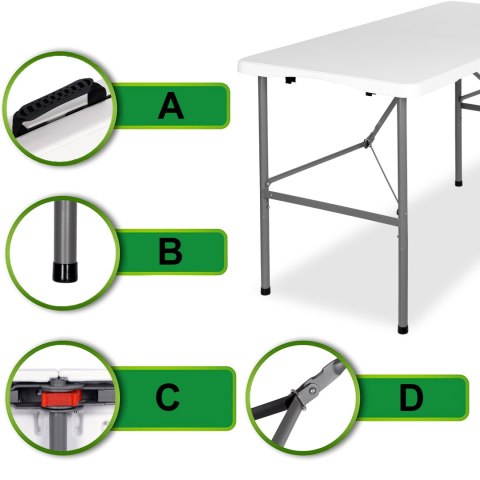 Stół cateringowy JUNE składany w walizkę 120 cm, doskonały na eventy, kemping, imprezy plenerowe, bankiety i spotkania firmowe. Wytrzymały blat z HDPE idealnie sprawdzi się jako stół ogrodowy, handlowy lub piknikowy. Solidna stalowa konstrukcja malowana proszkowo zapewnia stabilność, a blokada nóg i antypoślizgowe stopy dodatkowo ją wzmacniają. Stół składany, lekki, kompaktowy, łatwy do przenoszenia dzięki wygodnym rączkom. Po złożeniu tworzy ergonomiczną walizkę, co pozwala na łatwe przechowywanie. Wytrzymuje obciążenie do 100 kg - perfekcyjny wybór na każdą okazję!