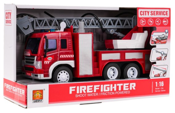 Interaktywna straż pożarna z funkcją dźwięku i światła, oraz lejącą się wodą dla dzieci od 3-go roku życia. Wóz strażacki został wykonany z najlepszej jakości materiałów w żywych kolorach. Posiada ruchome elementy takie jak regulowana drabina w górę i w dół,a także wydłużana i skracana. Na końcu drabiny znajduje się platforma z końcówką węża strażackiego, z którego leci woda. Na początku przyczepy, umieszczony jest zbiornik na wodę. Po napełnieniu zbiornika wodą wystarczy przycisnąć przycisk znajdujący się na górze zbiorniczka a poleci woda. Na dachu kabiny wozu strażackiego znajdują się przyciski, po naciśnięciu, na które usłyszymy sygnał syreny, klakson lub odgłos odpalania pojazdu. Odgłosom towarzyszy miganie koguta strażackiego. Pojazd posiada gumowe opony i napęd frykcyjny na przedniej osi. Zasilany jest bateriami AG13 (w zestawie).
