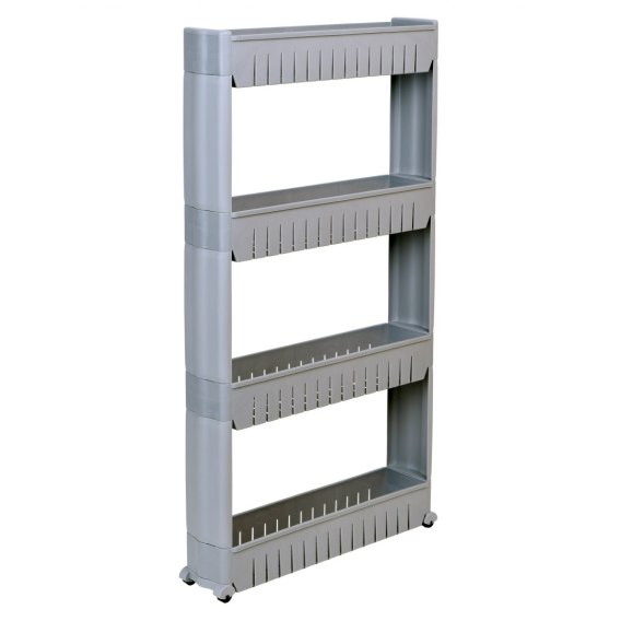 Doskonała do każdego wąskiego pomieszczenia mobilna szafka z trzema półkami. Konstrukcja modułowa wykonana z wytrzymałego tworzywa, pozwala na dodawanie lub odejmowanie półek. Kompaktowe wymiary sprawiają, że idealnie wpasuje się w wąskie przestrzenie pomiędzy szafką, a lodówką albo pralką. Cztery pojemne półki pozwolą na przechowywanie potrzebnych pod ręką niezbędnych akcesoriów np. przyprawy i akcesoria kuchenne, czy kosmetyki, akcesoria łazienkowe i środki czystości. Dzięki wyposażeniu w 4 kółka regał jest bardzo mobilny i w łatwy sposób można go przesuwać.