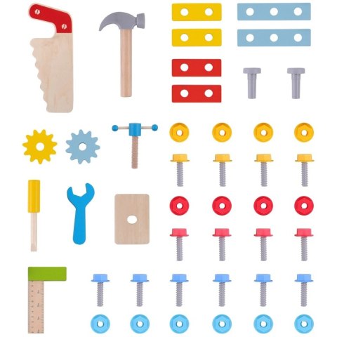 Stół Do Majsterkowania od marki TOOKY TOY będzie spełnieniem marzeń małej złotej rączki. W zestawie znajdziemy stolik wraz z różnorakimi zabawkowymi narzędziami: piłą, młotkiem, kluczem, śrubokrętem, imadełkiem, miarką, śrubkami, nakrętkami podkładkami i kołami zębatymi. Dzięki półkom i uchwytom stołu, dziecko będzie miało pod ręką niezbędne narzędzia i akcesoria, a elementy zestawu można mocować do stolika. Zabawka wykonana w sposób bezpieczny dla dzieci, rogi i krawędzie są zaokrąglone, by nie było ryzyka skaleczenia się.