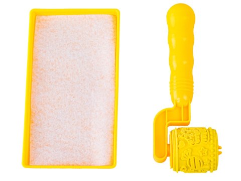 Duża ilość akcesoriów z pewnością urozmaici zabawę matą. Znajdziemy tutaj szablony plastikowe oraz piankowe do odrysowywania, pieczątki oraz rolkę ze wzorami do odbijania. Dla dzieci to super zabawa.