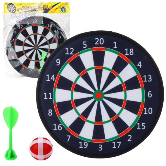 Zestaw zawiera ciemną tarczę o średnicy 28 cm, jedną strzałkę oraz jedną piłkę, obie zakończone rzepem. Tarcza posiada czytelną numerację oraz kolorystyczne strefy, które ułatwiają naukę liczenia i rozwijają refleks oraz precyzję.