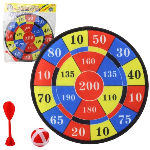 • Typ: tarcza z rzepem • Średnica tarczy: 28 cm • Materiał: miękka tkanina, tworzywo, rzep • Kolorystyka: wielokolorowa, podział punktowy • Montaż: możliwość zawieszenia