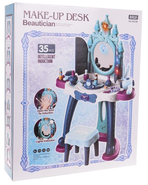 Bogato wyposażona interaktywna toaletka z funkcją światła i dźwięku dla dzieci od 3-go roku życia. Zabawka wykonana została z najlepszej jakości plastiku w żywych kolorach. Toaletka wyposażona jest w duży blat, szufladkę, półeczki oraz duże otwierane lustro, które posiada efekty dźwiękowe takie jak wesołe melodie, oraz efekty świetlne. Nad lustrem znajduje się czujnik, który otwiera i zamyka magiczne wrota do lustra. Na lustrze toaletki wyświetlają się postacie księżniczek. Do toaletki dołączono taboret oraz mnóstwo akcesoriów do malowania. Toaletka zasilana jest bateriami typu 3 x AA 1,5 V (baterii brak w zestawie).