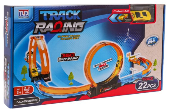 Tor wyścigowy z pętlami dla dzieci od 3-go roku życia. Tor wykonano z najlepszej jakości plastiku w żywych kolorach. Na zestaw składa się 22 elementy do samodzielnego montażu. Zestaw posiada odcinki proste do rozpędzenia pojazdu, pętlę 360 stopni i jeden pojazd. Pojazd napędzany jest napędem pull back. Wystarczy delikatnie nacisnąć pojazd do tyłu, by przejechał tor z pełną mocą.