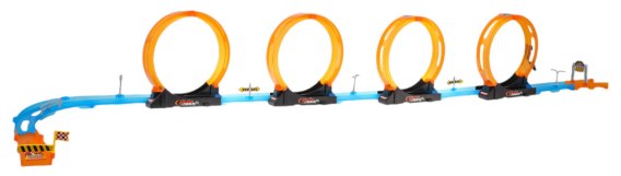 Tor wyścigowy z czterema pętlami 360 stopni, dla dzieci od 3-go roku życia. Tor wykonano z najlepszej jakości plastiku w żywych kolorach. Na zestaw składa się 31 elementów do samodzielnego montażu. Tor posiada odcinki proste do rozpędzenia pojazdu, 4 pętlę 360 stopni i dwa pojazdy. Pojazdy napędzane są napędem pull back. Wystarczy delikatnie nacisnąć pojazd do tyłu, by przejechał tor z pełną mocą.