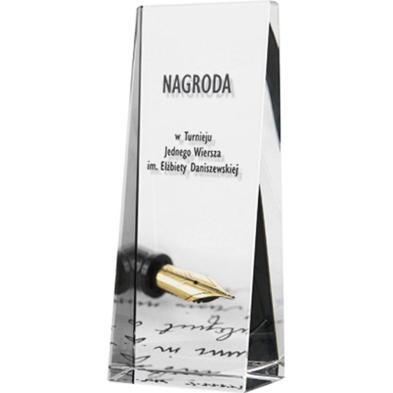 Trofeum szklane z nadrukiem kolorowym LuxorJet, grawerowaniem oraz wypełnieniem farbą i etui