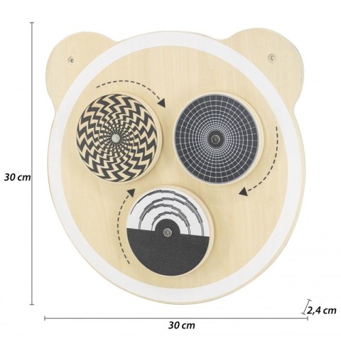 Jedna z serii drewnianych tablic z uroczą głową misia. Tablica z trzema kółkami, które zostały odpowiednio pomalowane, aby poprzez kręcenie wywoływać złudzenia optyczne. Zabawka pomaga w rozwijaniu logicznego myślenia u dzieci, pomaga również w rozwijaniu wyobraźni. Produkt idealnie sprawdzi się zarówno w domowym zaciszu, jak i w placówkach oświatowych, wczesnoszkolnych. Ciekawe przygotowanie formy tablicy z pewnością przykuje uwagę każdego malucha. Całość wykonana została z drewna lakierowanego i pomalowana nietoksycznymi farbami w żywe barwy, które zadowolą każdego użytkownika i dadzą mnóstwo radości z zabawy. Produkt przeznaczony dla dzieci od 18 miesiąca życia. W naszej ofercie dostępna jest cała seria tablic z głową misia.