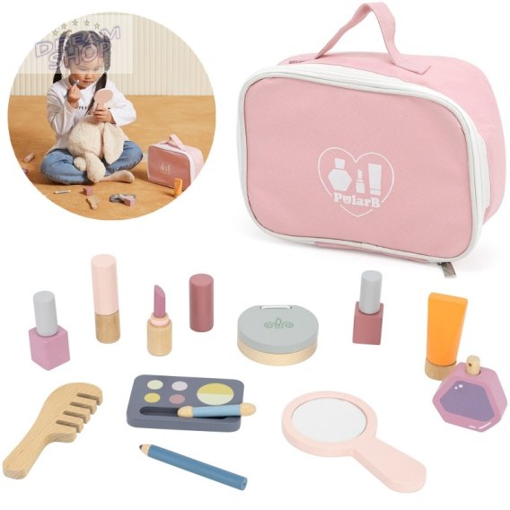 Drewniany Zestaw do Makijażu w przenośnej kosmetyczce od firmy Viga zawiera wszystko, co potrzebuje mała wizażystka w salonie piękności. Zabawka rozwija kreatywność i precyzję ruchów. W skład zestawu wchodzą drewniane elementy takie jak okrągłe bezpieczne lusterko, paletkę cieni z aplikatorem, puderniczkę z lusterkiem, 2 lakiery do paznokci, 2 szminki, flakonik perfum, grzebień, tubkę i torbę do ich przechowywania, która pozwala na trzymanie zestawu zawsze pod ręką. Produkt wykonany z myślą o małych rączkach dziecka. Solidne i precyzyjne wykonanie bez ostrych krawędzi sprawia, że jest w 100% bezpieczny dla naszej pociechy. Zabawka zadowoli każdą małą księżniczkę i pozwoli na stworzenie swojego kącika piękności.
