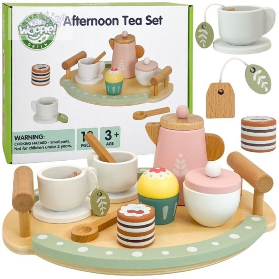 - Kreatywność - Drewniane akcesoria (filiżanki, czajnik, ciastko...) pozwalają dziecku organizować własne przyjęcia herbaciane, eksperymentować z ustawianiem elementów, tworzyć nowe kombinacje i scenariusze bez sztywnych ograniczeń.