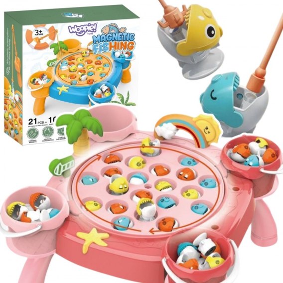 Łowienie rybek na magnes od marki WOOPIE  to zabawka, która naśladuje wędkowanie, ale z wykorzystaniem magnesów. Składa się m.in z wędki z magnesem którą można łowić rybki z metalowymi elementami, a później złowione zdobycze umieszczamy do przymocowanych wiaderek na planszy. Gra ta ma na celu rozwijanie zręczności manualnej, koordynacji ręka-oko oraz precyzji. Jest to także zabawa, która może być wykorzystana do nauki kolorów, kształtów oraz liczenia, gdyż rybki różnią się kolorem i kształtem. Łowienie rybek jest popularną zabawką dla dzieci w wieku przedszkolnym i wczesnoszkolnym, zapewniającą zarówno rozrywkę, jak i rozwijanie umiejętności poznawczych i motorycznych. Dodatkowo, jest bezpieczną alternatywą dla tradycyjnego wędkowania, szczególnie dla dzieci, które nie są jeszcze gotowe na prawdziwe rybołówstwo.