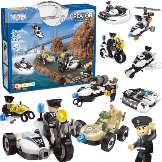 Zestaw klocków Creator City Police Force od marki Woopie pozwoli mu wcielić się w rolę odważnego policjanta i samodzielnie budować różne pojazdy - motocykle, auta terenowe, łodzie i quady. To świetna zabawa, która rozwija kreatywność, uczy logicznego myślenia i daje wiele godzin frajdy. Zestaw jest idealny dla fanów konstrukcji i policji, a przy tym świetnie sprawdzi się jako prezent. Wygodne pudełko z rączką pozwala zabrać zestaw wszędzie ze sobą!