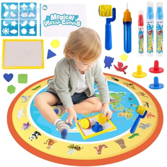 Magiczna mata wodna Magical Water Canvas od marki Woopie to kreatywna i edukacyjna zabawka, która zachwyci każde dziecko. Dzięki specjalnym pisakom wodnym malowanie jest całkowicie bezpieczne - wystarczy woda, aby tworzyć niesamowite rysunki i wzory. Kolorowa mapa świata z zaznaczonymi zwierzętami sprawia, że zabawa staje się także okazją do nauki geografii i poznawania przyrody. W zestawie znajdują się liczne akcesoria: stempelki, szablony, wałek, pisaki i gąbka - które urozmaicają twórczość. To idealny pomysł na prezent, który rozwija wyobraźnię i gwarantuje godziny radosnej zabawy bez bałaganu.