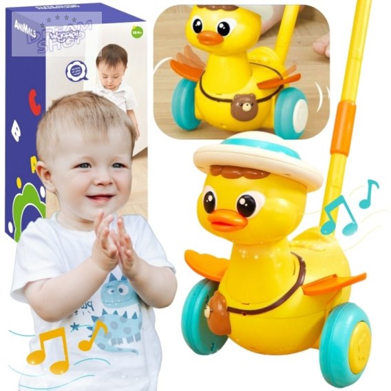 Radosna kaczuszka na kiju marki Woopie zaprasza do pierwszych spacerów. Macha skrzydełkami, świeci i gra wesołe melodie, zamieniając każdy krok w małą przygodę pełną ruchu i śmiechu. Dzięki lekkiej konstrukcji i stabilnym kółkom maluch chętnie pcha ją po domu, a intuicyjne przyciski zachęcają do samodzielnej zabawy i odkrywania dźwięków.