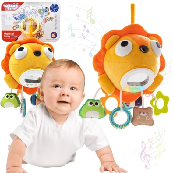 Ten pluszowy, muzyczny lew od marki Woopie to idealny towarzysz snu i zabawy dla każdego malucha. Połączenie delikatnej muzyki, uspokajających światełek i różnorodnych tekstur sprawia, że zabawka jest doskonałym narzędziem do stymulacji zmysłów dziecka i zapewnia mu poczucie bezpieczeństwa. Zabawka ma kształt uroczego, pluszowego lwa z lusterkiem. Do jego tułowia przymocowane są sześc , różnych zawieszek w różnych kształtach. Dwie z nich to bezpieczny gryzak, jedna pełni funkcje grzechotki a pozostałe zabawne pluszaki stymulują rozwój motoryczny i sensoryczny dziecka. Zabawkę można łatwo zawiesić na łóżeczku, wózku lub foteliku samochodowym dzięki praktycznemu uchwytowi, co zapewnia rozrywkę i ukojenie w każdej sytuacji.