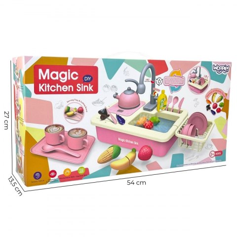 Zlewozmywak Kuchenka 2w1 od marki WOOPIE pozwoli dzieciom gotować i zmywać tak jak ich rodzice - naśladować od najmłodszych lat! Zabawka jest doskonale odwzorowana, dzięki czemu dziecko ma wrażenie, że wykonuje prawdziwe czynności kuchenne.Posiada ruchome elementy jak kurek od kranu, z którego leci prawdziwa woda. Wystarczy wlać do misy modę i zobaczyć jak dziecko się bawi, a po wszystkim wystarczy opróżnić dolną misę. Dodatkowo owoce i warzywa są połączone rzepem, dzięki czemu twoje dziecko może przekroić je na pół, jak prawdziwe produkty! Zabawa w gotowanie, zmywanie naczyń i wykonywanie podobnej pracy, pomaga dzieciom nabrać poczucia odpowiedzialności i samodzielności, która jest ważną częścią uczenia się społeczno-emocjonalnego.