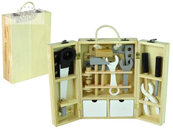 Zabawka jest łatwa w przenoszeniu, można ją również zawiesić na stanie, dzięki uchwytowi na sznurku. Klasyczne drewno oraz jego wytrzymałość sprawiają, że od zawsze cieszy się ono ogromnym uznaniem. Surowiec ten wygląda dobrze zarówno w naturalnym kolorze, jak i pomalowany. W tym przypadku pomalowany jest na szary, czarny i biały. Wewnątrz skrzynki znajdują się odpowiednie szufladki i przegrody, dzięki czemu narzędzia będą poukładane i na swoim miejscu. Można je zabrać również ze sobą, gdzie wspólnie z rówieśnikami możesz naprawiać lub rozkręcać zabawki. Cała walizka jest zamykana na klamry.
