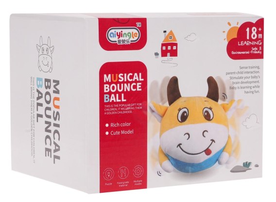 Wesoła skacząca krowa z funkcją dźwięków i świateł, dla maluszków od 18-go miesiąca życia. Krówka na pierwszy rzut oka jest milutką, pluszową przytulanką, ale kryje w sobie tajemnicę. W środku znajduje się okrągły element funkcyjny. Po uruchomieniu go krówka skacze, przemieszcza się i wydaje z siebie wesołe melodie. Kuleczka w środku posiada podświetlenie. W zestawie znajduje się pilot sterujący krówką. Element funkcyjny może być wyjmowany ze środka i ładowany za pomocą kabla USB, znajdującego się w zestawie. Krówka zasilana jest akumulatorem typu 3,7 V (w zestawie), pilot bateriami typu 1 x CR2025 3 V (w zestawie).