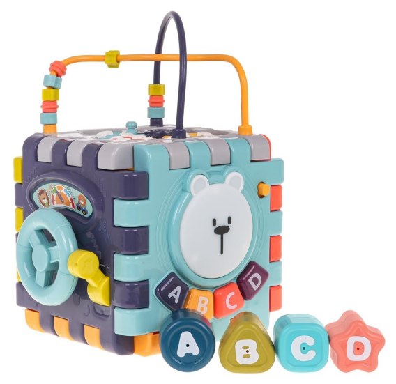 Wielofunkcyjna interaktywna kostka z efektami dźwiękowymi i świetlnymi dla dzieci od 18-go miesiąca życia. Każda ścianka boxu zapewni dziecku wiele frajdy i interaktywnej zabawy. Efekty dźwiękowe i świetlne oraz bogactwo kolorów, przyciągnie wzrok maluszka i zachęci do zabawy. Kostkę możemy rozkładać  i bawić się poszczególnymi elementami na płasko. Zabawka zasilana jest bateriami typu 3 x AAA 1,5 V (brak w zestawie).