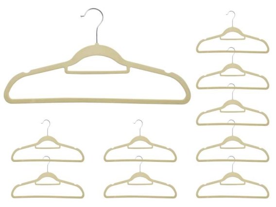 Zestaw wieszaków na ubrania to podstawowy element wyposażenia naszych szaf. Szczególnie popularne są w ostatnim czasie wieszaki welurowe, ponieważ zajmują mało miejsca a ich antypoślizgowa powłoka sprawia, że ubrania nie ześlizgują się i pozostają gładkie.