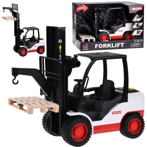 Duży wózek widłowy z paletom to idealny wybór dla każdego małego fana motoryzacji oraz budownictwa. Pojazd został dokładnie odwzorowany co sprawia że wygląda bardzo realistycznie. Auto posiada napęd frykcyjny, dzięki czemu po wprawieniu w ruch kół leżących na podłożu, porusza się. Wózek widłowy wykonany został w całości z plastiku, posiada ruchome elementy, efekty świetlne, dźwiękowe, zaś koła są gumowe co pozwoli na lekkie poruszanie się pojazdu. Dodatkową zaletą jest regulowany podnośnik, który możemy uruchomić za pomocą pokrętła znajdującego się w górnej części podnośnika. Pojazd na pewno będzie fajnym uzupełnieniem kolekcji maszyn budowlanych każdego miłośnika tych pojazdów i sprosta każdemu ładunkowi.