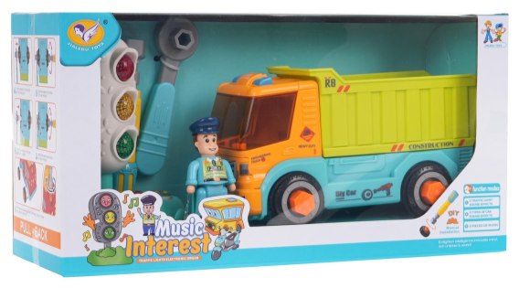 Wywrotka do rozkręcania z akcesoriami dla dzieci od 3-go roku życia. Zabawka wykonana została z najlepszej jakości plastiku w żywych kolorach. Pojazd możemy rozłożyć na czynniki pierwsze, w zestawie znajdują się 2 śrubokręty. W zestawie znajduje się też interaktywna sygnalizacja świetlna z efektami dźwięku i światła oraz figurka policjanta. Pojazd posiada gumowe bieżniki na oponach, trzymające przyczepność do podłoża oraz napęd na tył. Przednią część pojazdu możemy podnosić i na siedzeniu pojazdu umieścić figurkę policjanta. Pojazd zasilany jest bateriami typu 2 x AAA 1,5 V (brak w zestawie), sygnalizacja bateriami typu 2 x AAA 1,5 V (brak w zestawie).