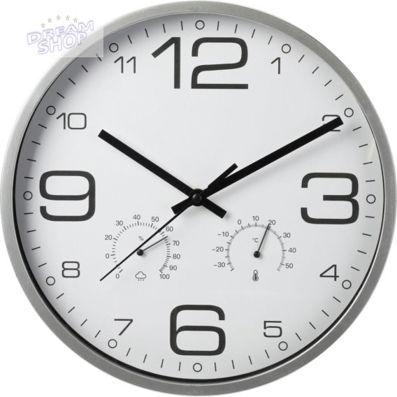 ZEGAR ŚCIENNY 30CM Z TERMOMETREM BIAŁY to nowoczesny zegar z wyraźnym wyświetlaczem czasu, temperatury i stopnia wilgotności powietrza. Ma prosty, minimalistyczny wygląd i jest idealny do biur, nowoczesnych wnętrz a nawet miejsc pracy.