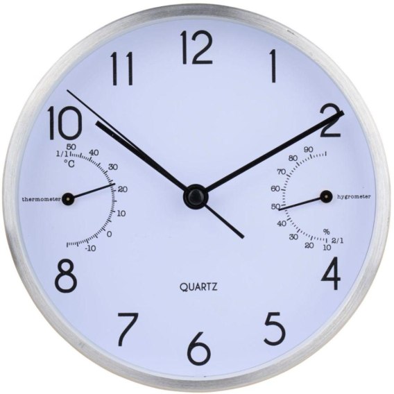 z cyframi arabskimi wskazującymi każdą godzinę,z termometrem i higrometrem