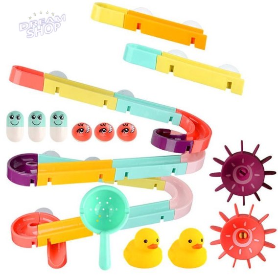 Zestaw składa się z 44 elementów, do zbudowania samodzielnie zjeżdżalni dla zabawek. Dzieci uwielbiają się pluskać w wodzie, a czasami nie lubią myć głowy, ale zachęcający tor zajmie ich zabawą i wówczas może uda się się umyć maluchowi włosy bez awantury.